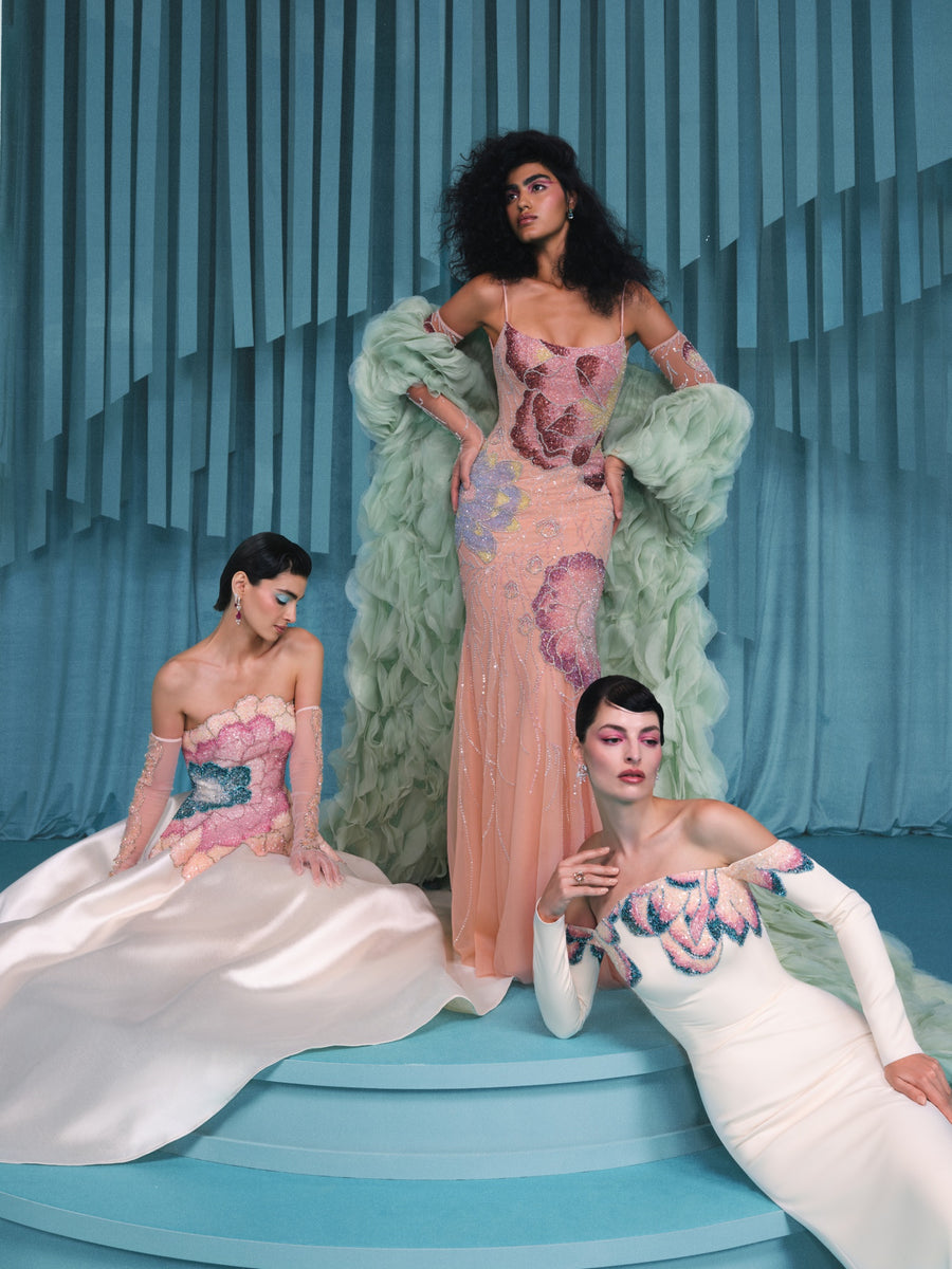 In the ateliers of Waad Aloqaili Couture, a gown has been exquisitely crafted, mirroring the cultural renaissance of Saudi Arabia. It tells the story of a nation on the verge of a flourishing new era. This piece is a modern ode to heritage, interpreted through the refined lens of haute couture. The delicate pink crepe fabric serves as a canvas, depicting the narrative of the altaifi flower, a token of Saudi Arabia's innate grace.