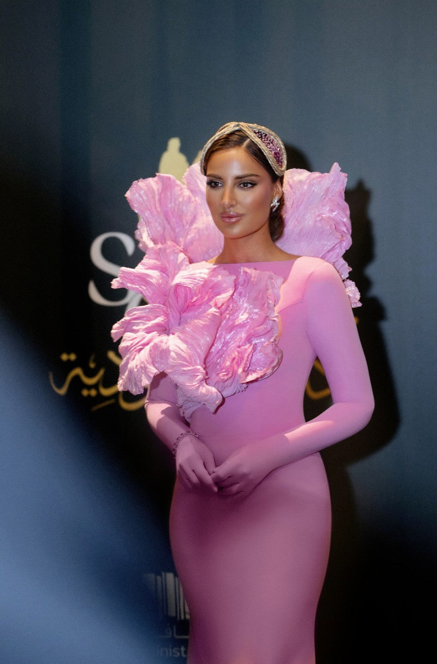 يُشكل قماش الكريب الوردي الناعم لوحة تحكي قصة الورد الطائفي، الرمز الفاتن لجمال السعودية. يتألق الفستان بتشكيل زهرة ثلاثية الأبعاد تنساب من الأمام إلى الخلف، تلتقط بذلك جوهر الزهرة وتعكس قصة ازدهار الأمة. يتميز الفستان بقفاز متصل وتفاصيل دقيقة تشمل طيات محكمة وتجاعيد ناعمة تُعزز ملمس الوردة، مُضفيةً حياة وحركة في الصورة الظلية للورد الطائفي.