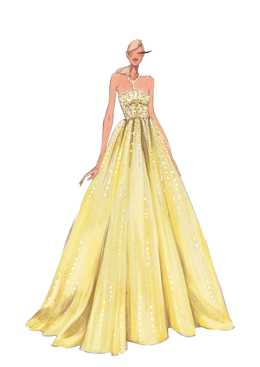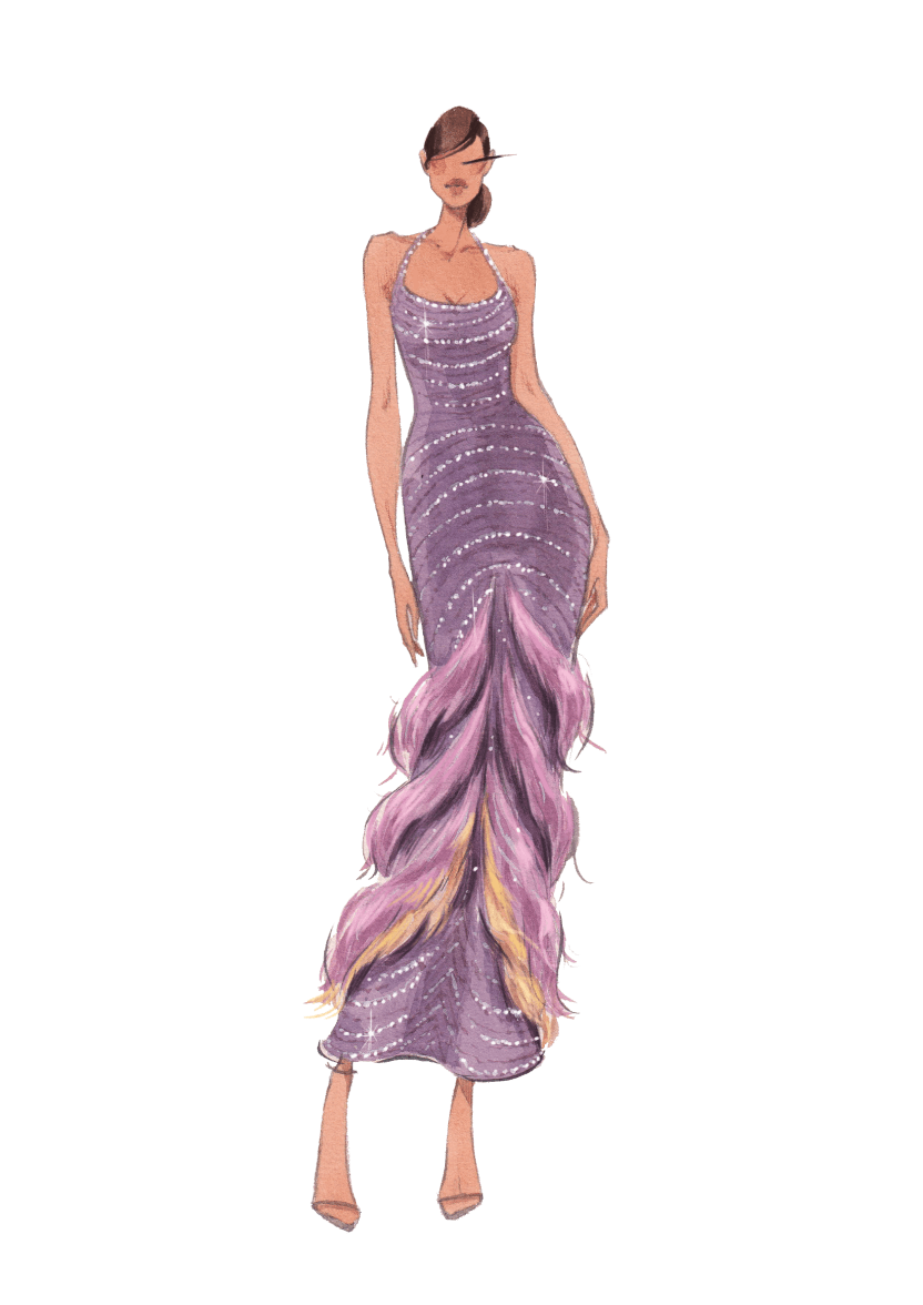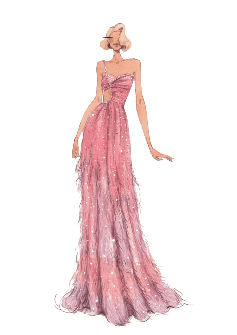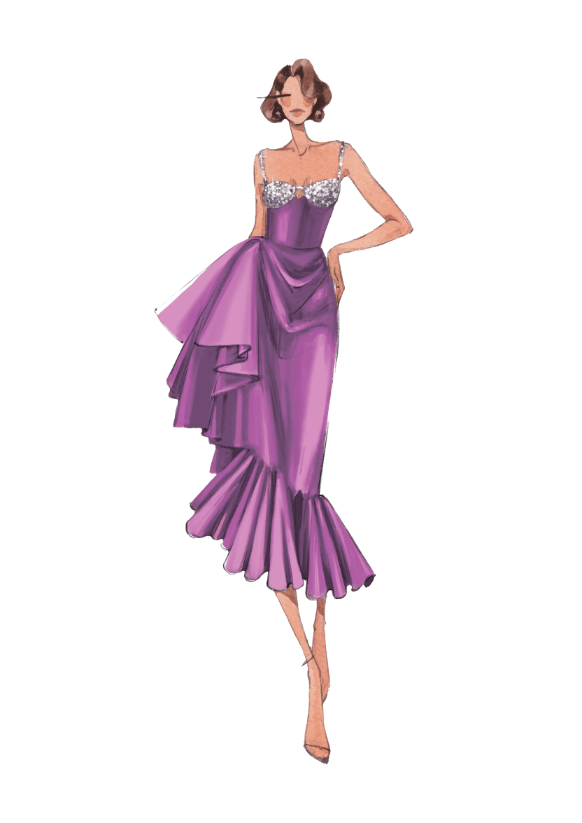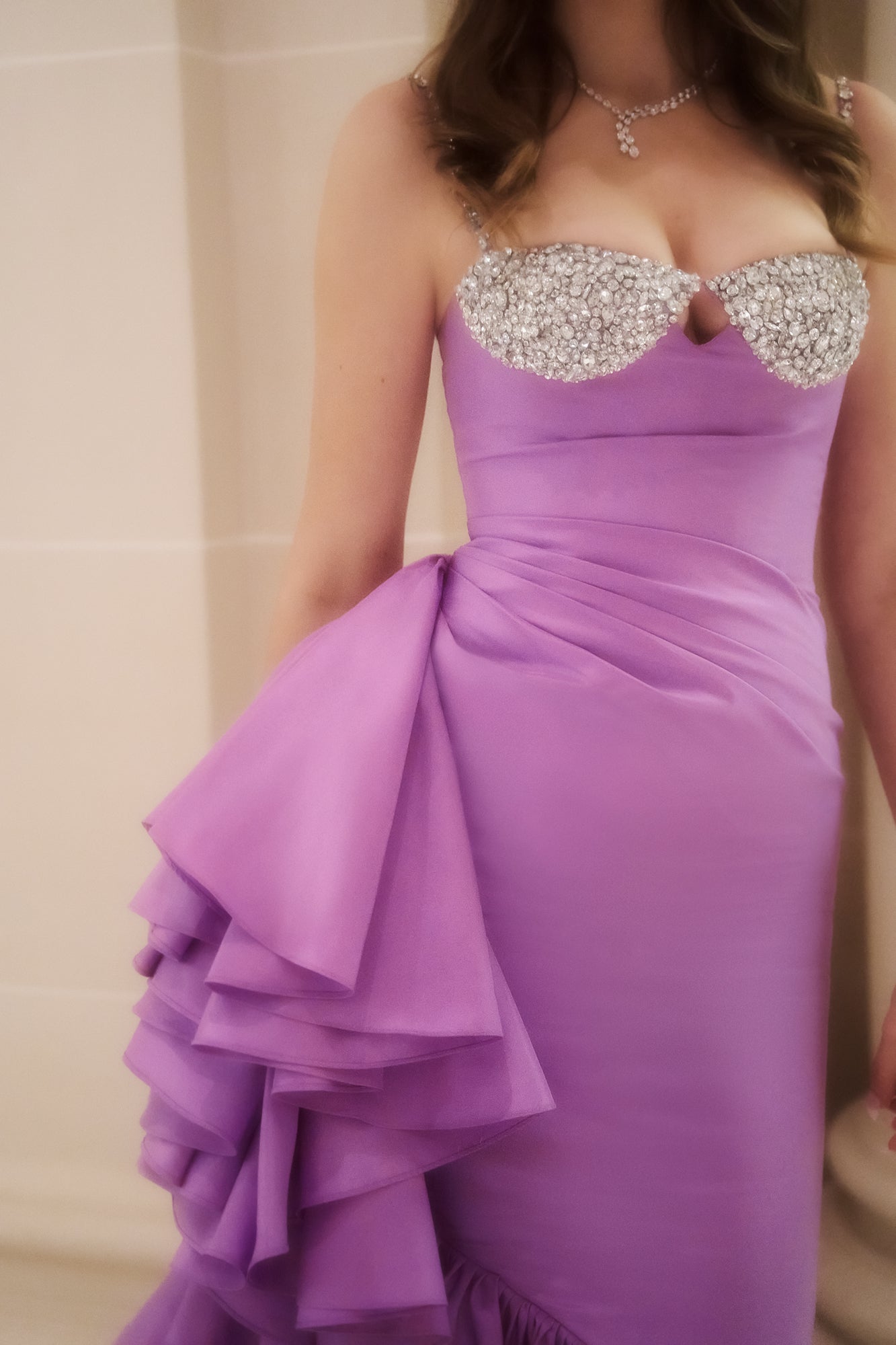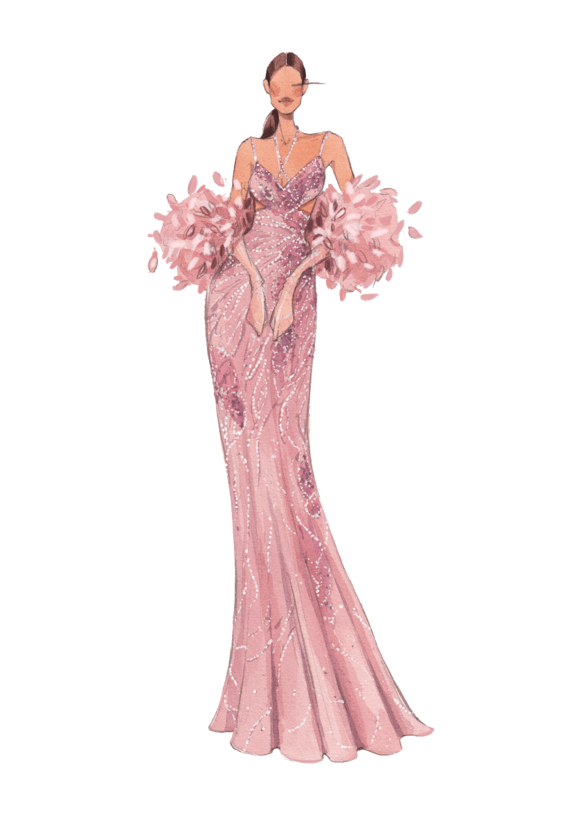 Across the collection, georgette, tulle and satin form body-skimming and waisted cuts, with ruffles and feathers envisaging a butterfly fluttering its wings before its maiden flight.