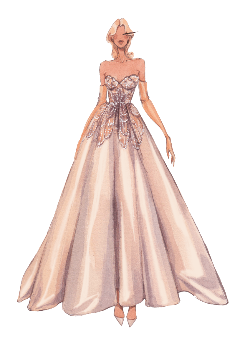 A myriad of beads, sequins and crystals, which applied by hand, form delicate corollas or mimic the intricate scales of a butterfly’s incredible wings. As the wearer moves, the dress creates its own energy; the light dances and any nervousness or trepidation falls away. Everything is as it should be.