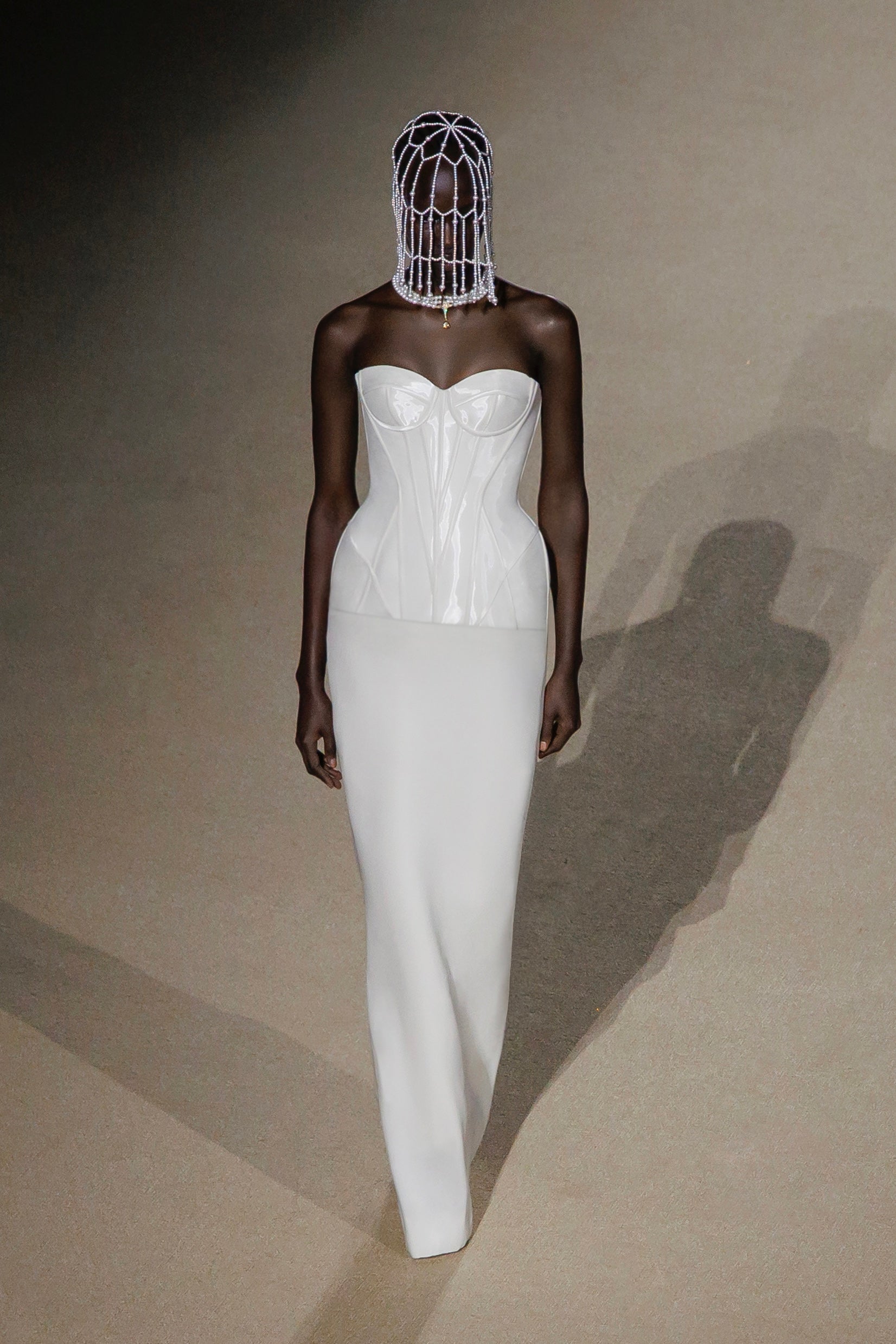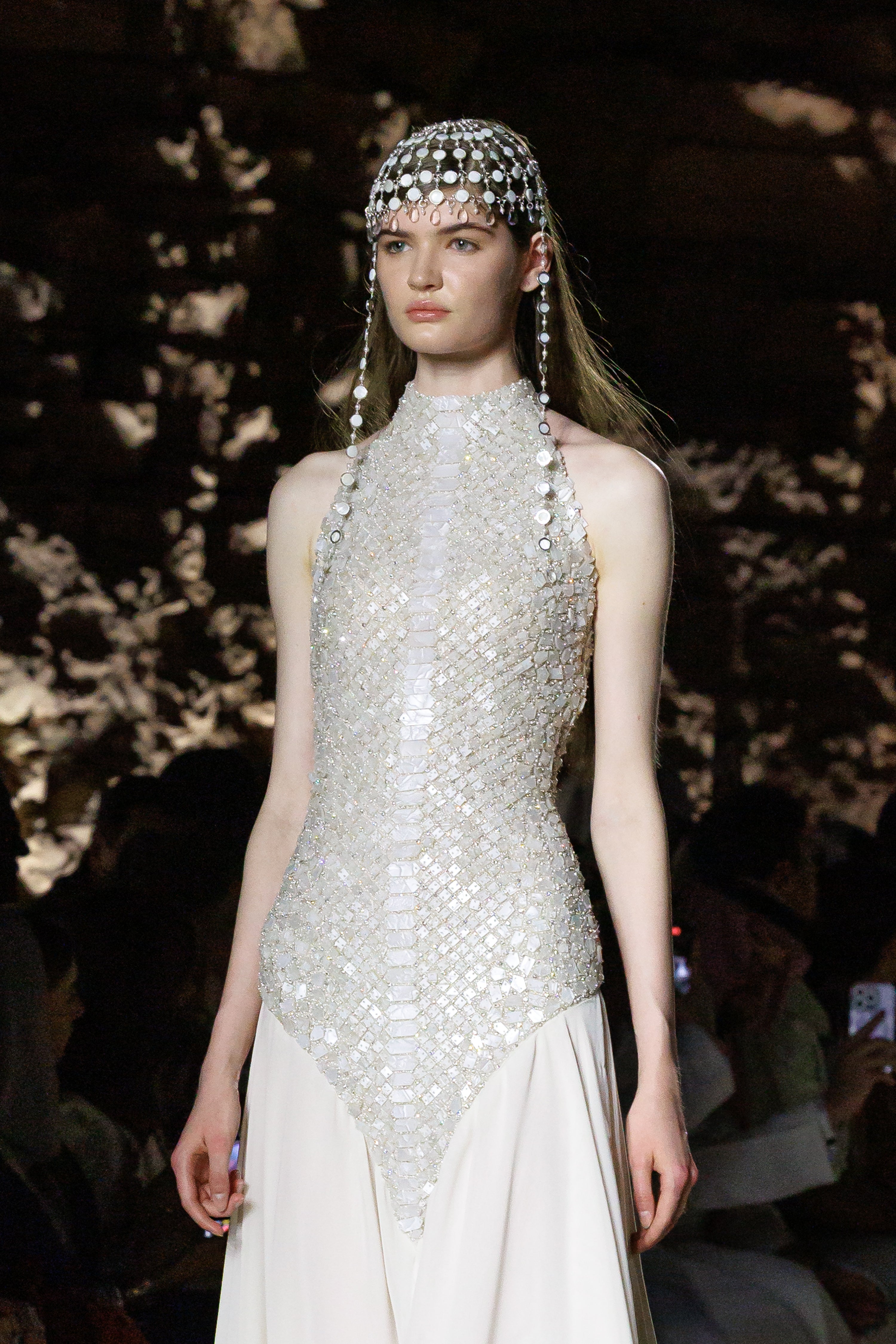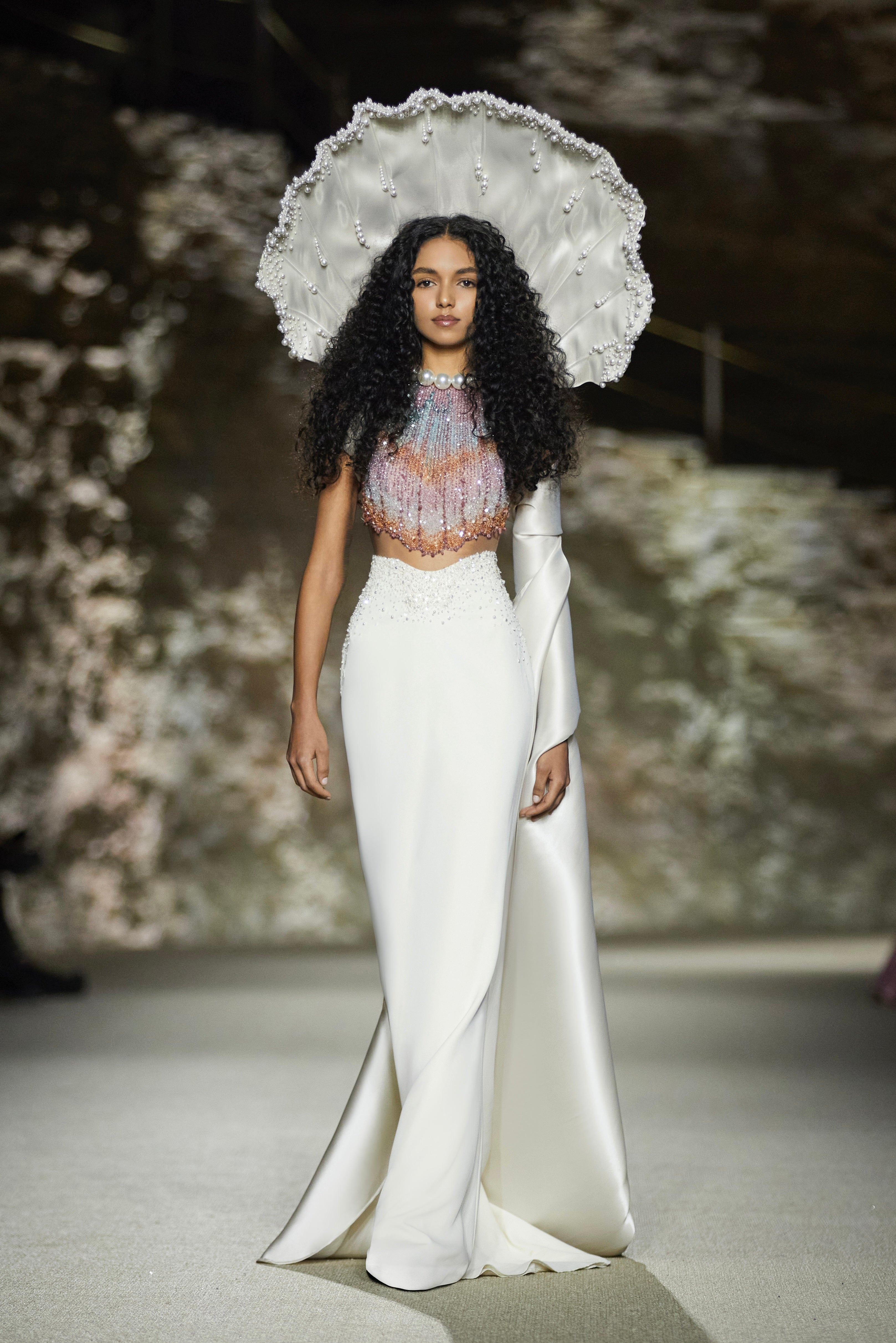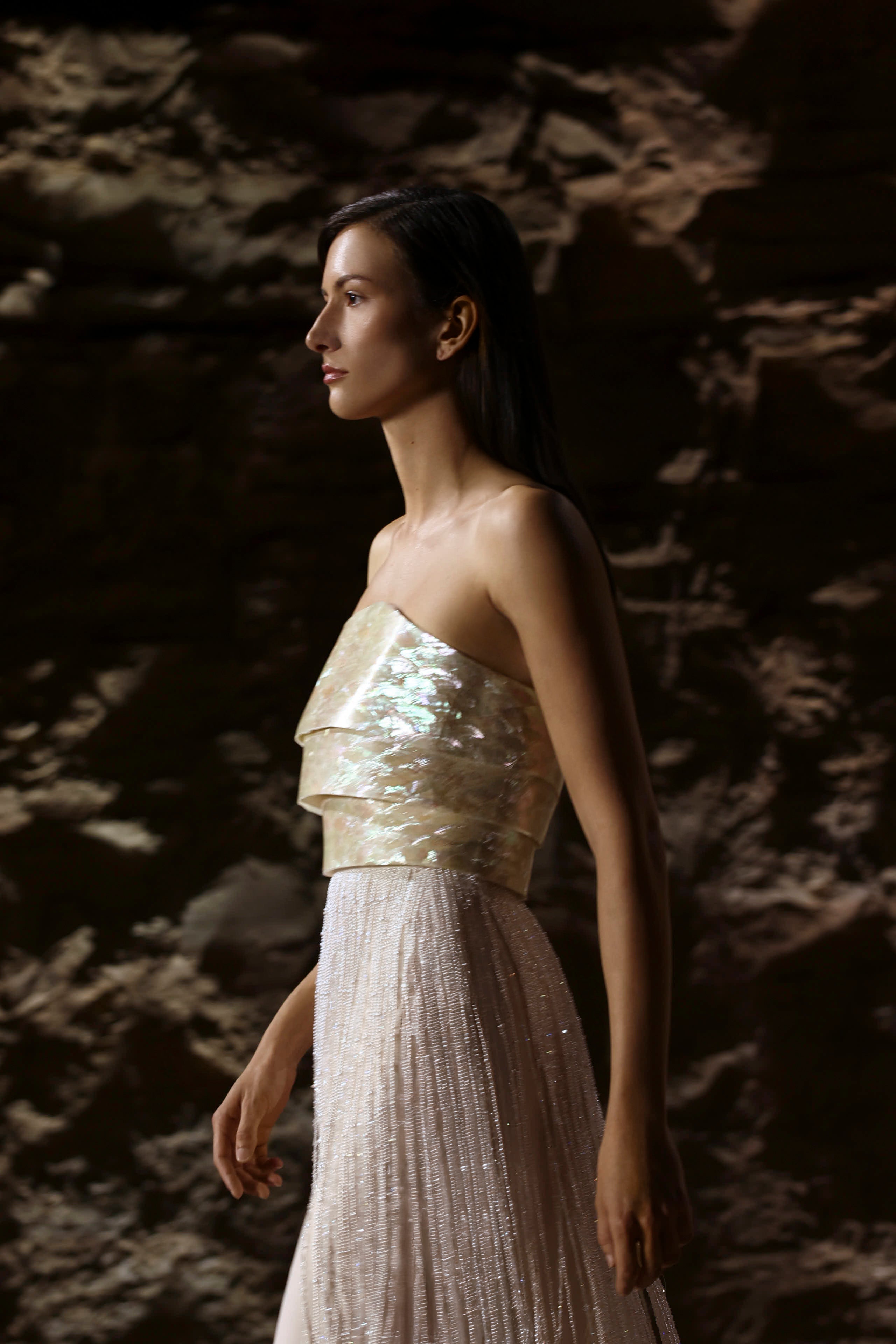 The collection traces the diver’s journey from shore to depth, and back to light. Silhouettes move with controlled fluidity: chiffons and liquid satins balanced by sculpted corsetry, nacre elements, and shell-inspired forms, where softness and strength exist in deliberate tension.