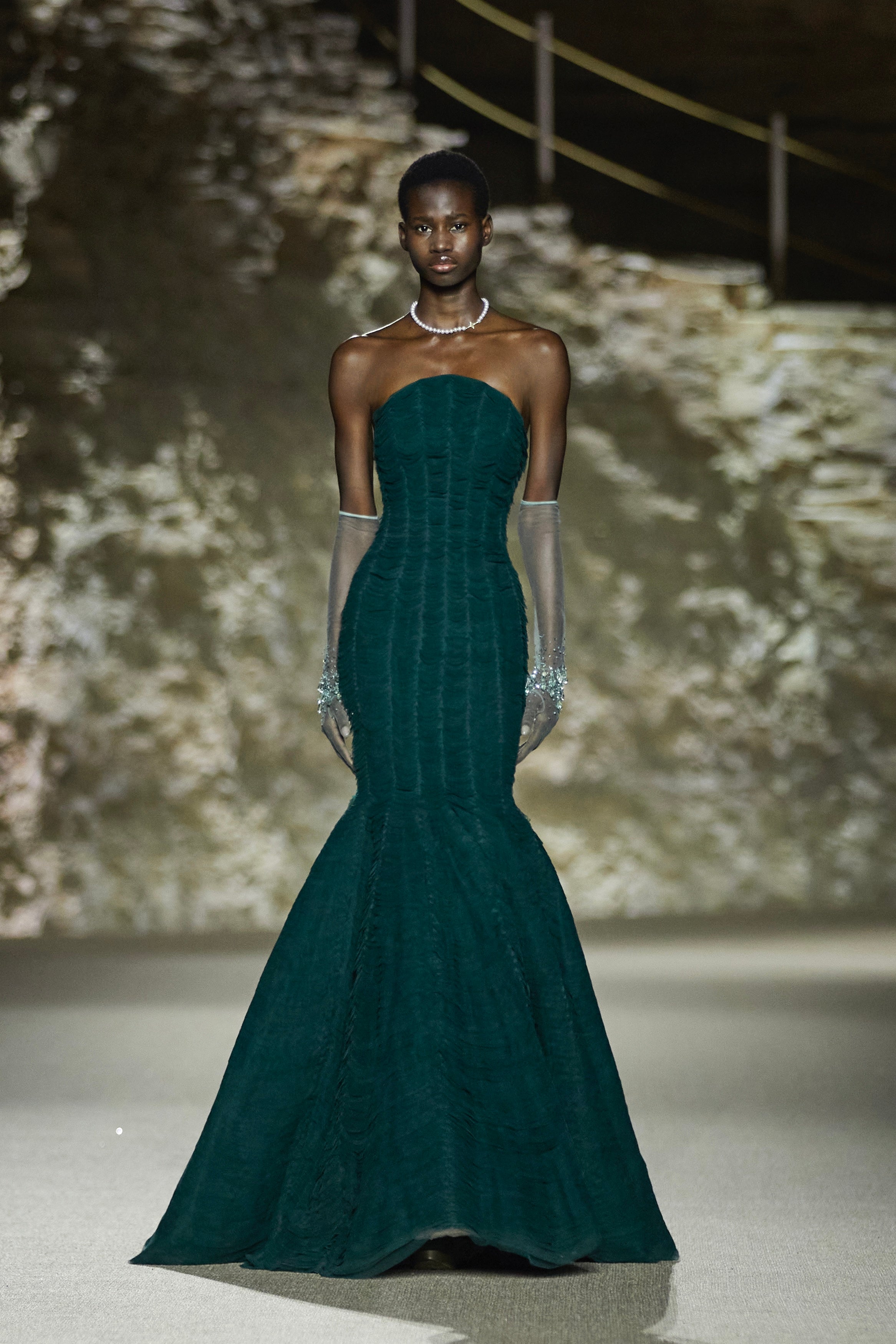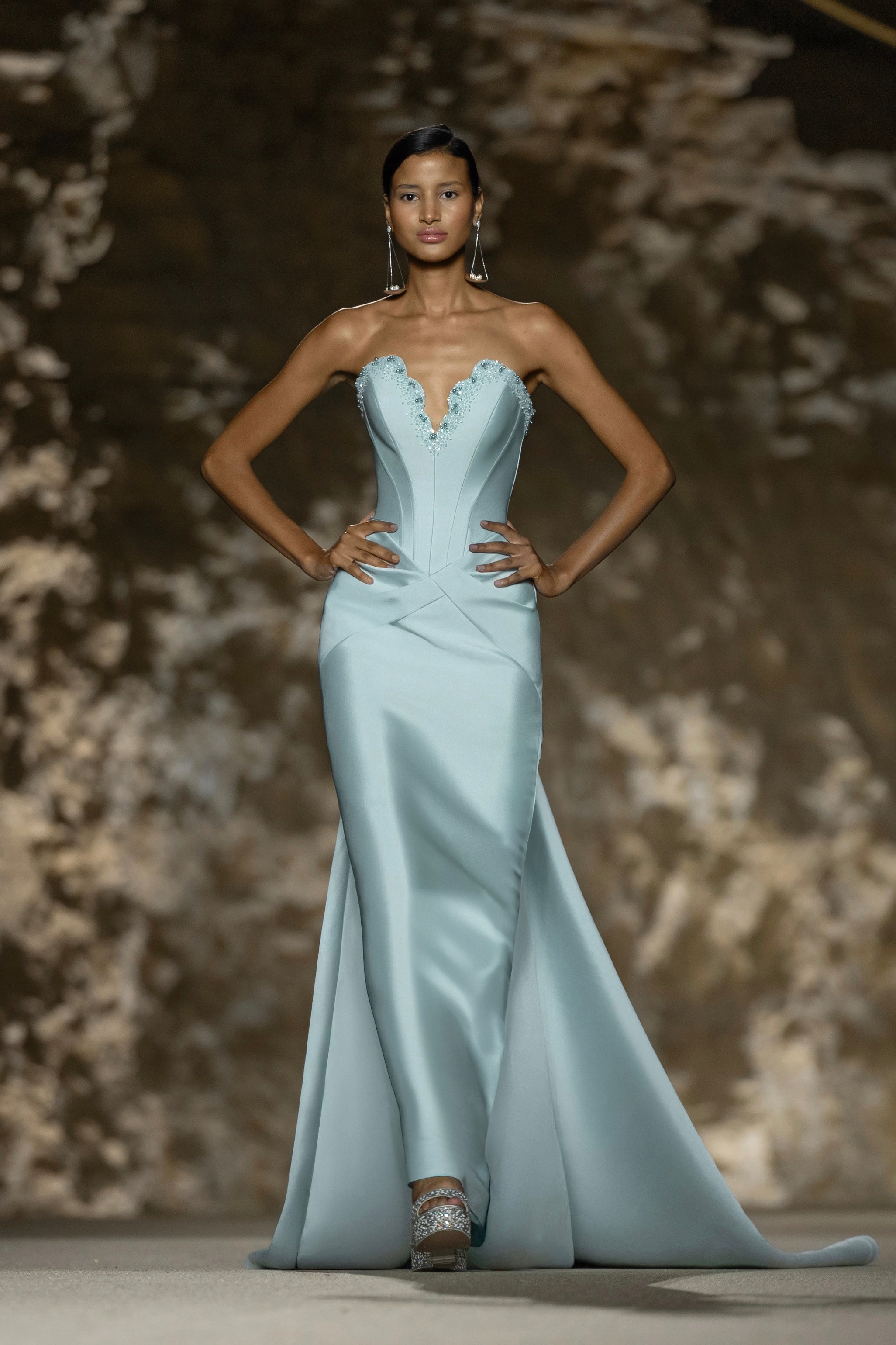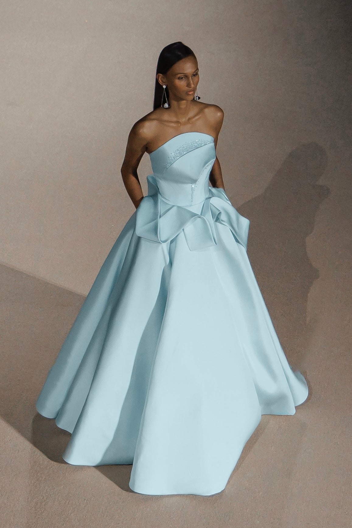 The collection traces the diver’s journey from shore to depth, and back to light. Silhouettes move with controlled fluidity: chiffons and liquid satins balanced by sculpted corsetry, nacre elements, and shell-inspired forms, where softness and strength exist in deliberate tension.
