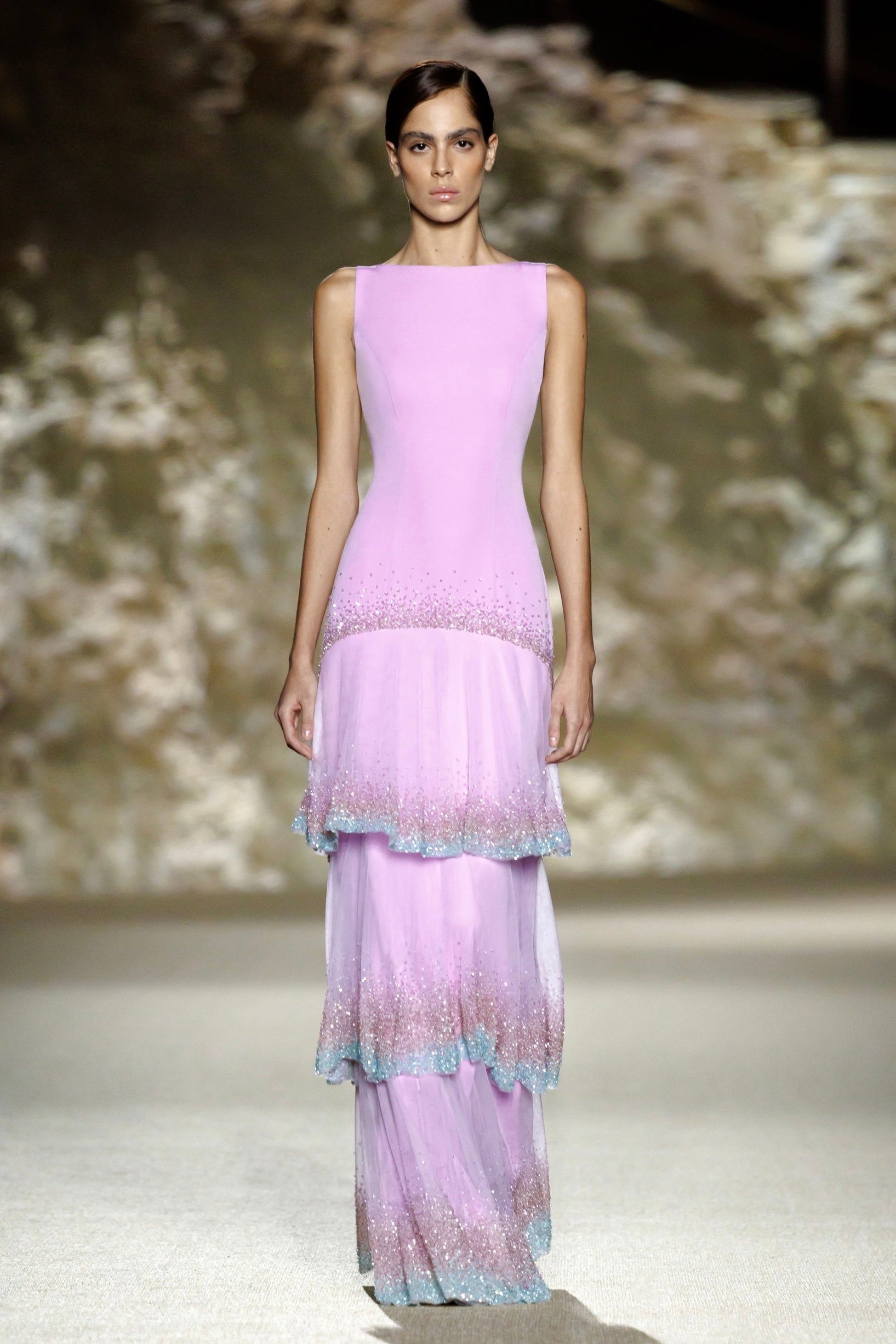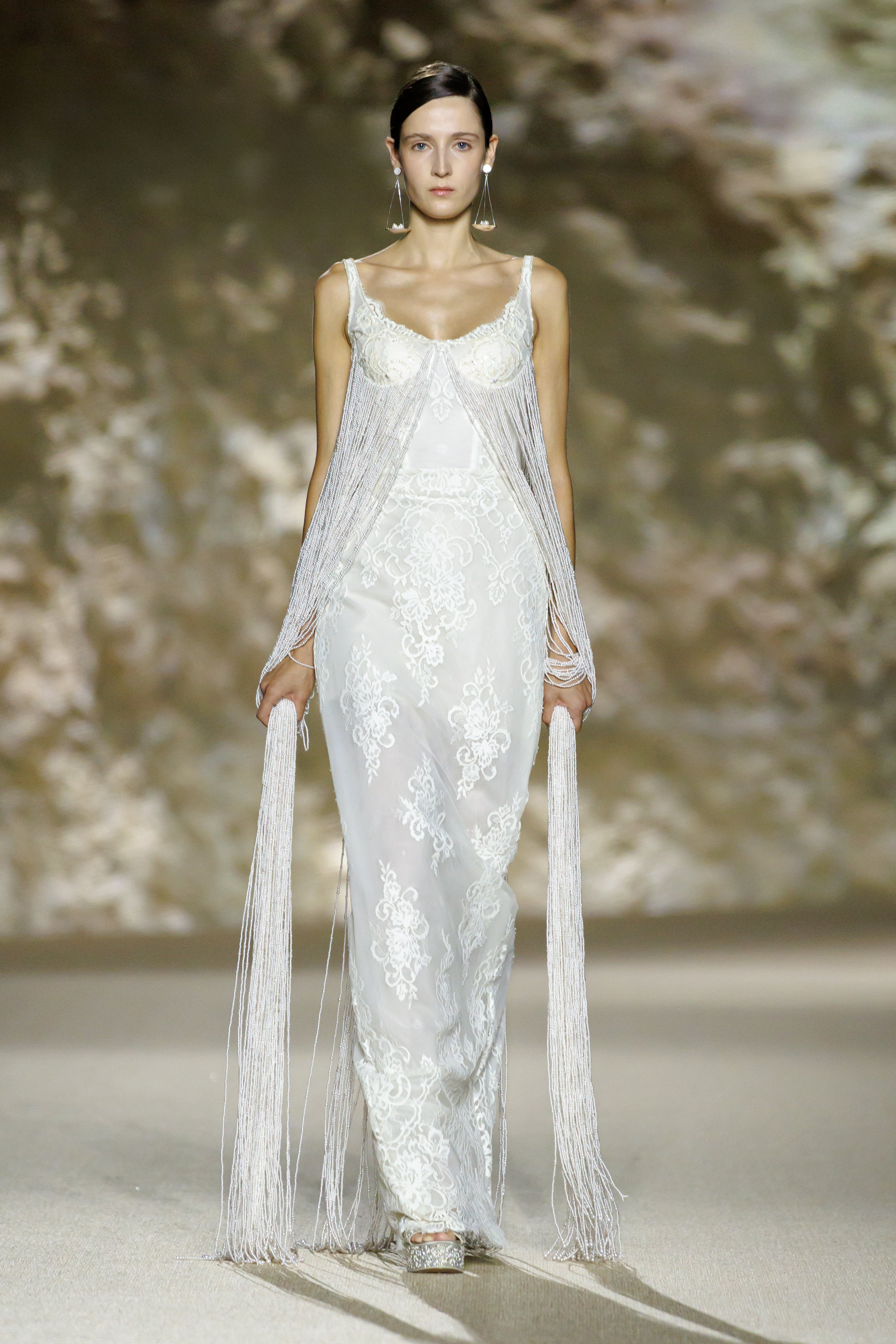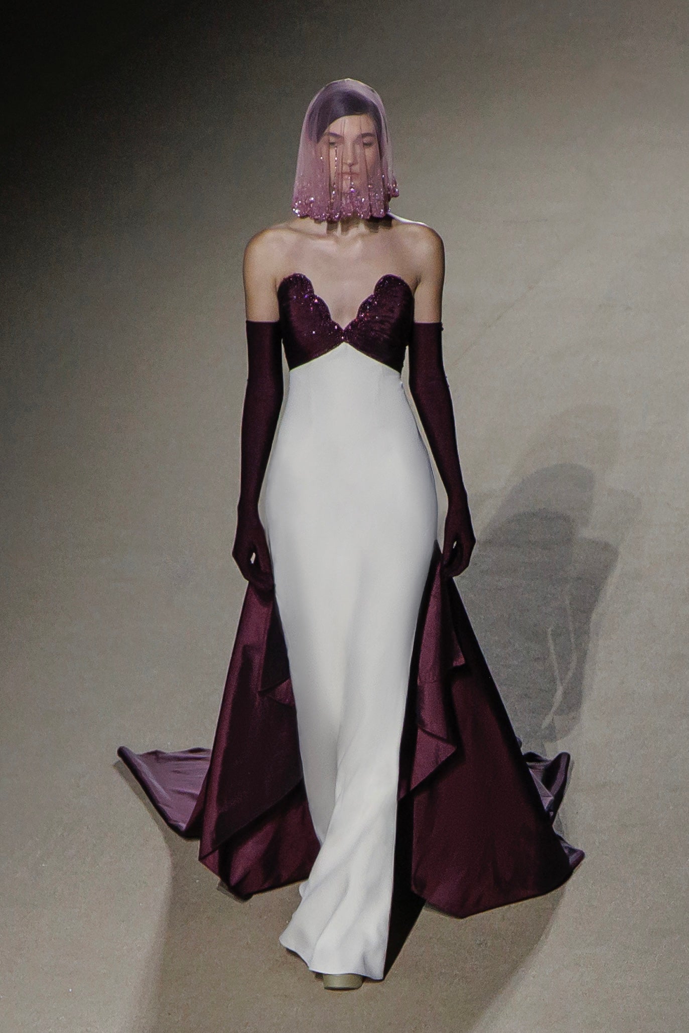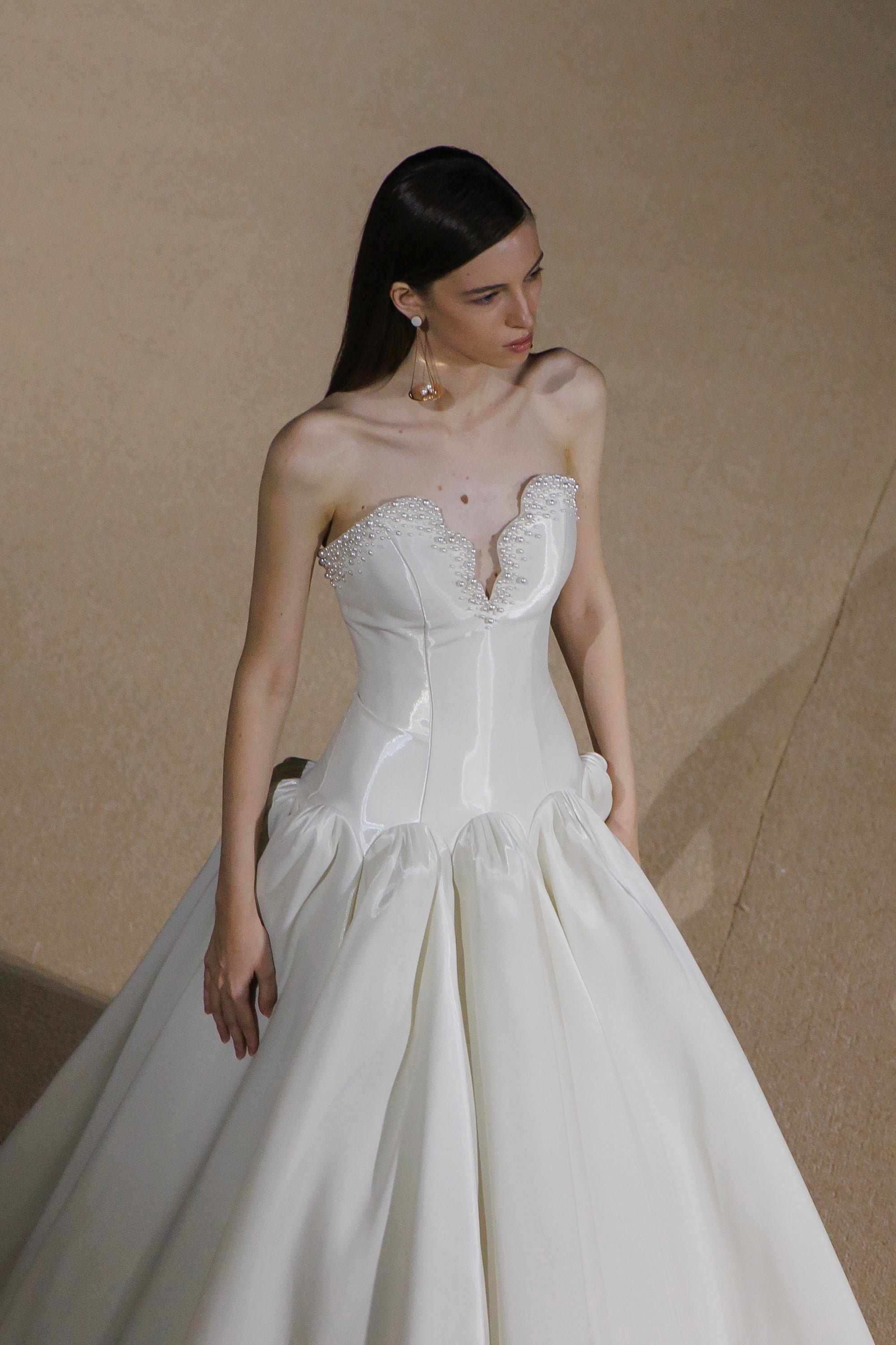 The collection traces the diver’s journey from shore to depth, and back to light. Silhouettes move with controlled fluidity: chiffons and liquid satins balanced by sculpted corsetry, nacre elements, and shell-inspired forms, where softness and strength exist in deliberate tension.