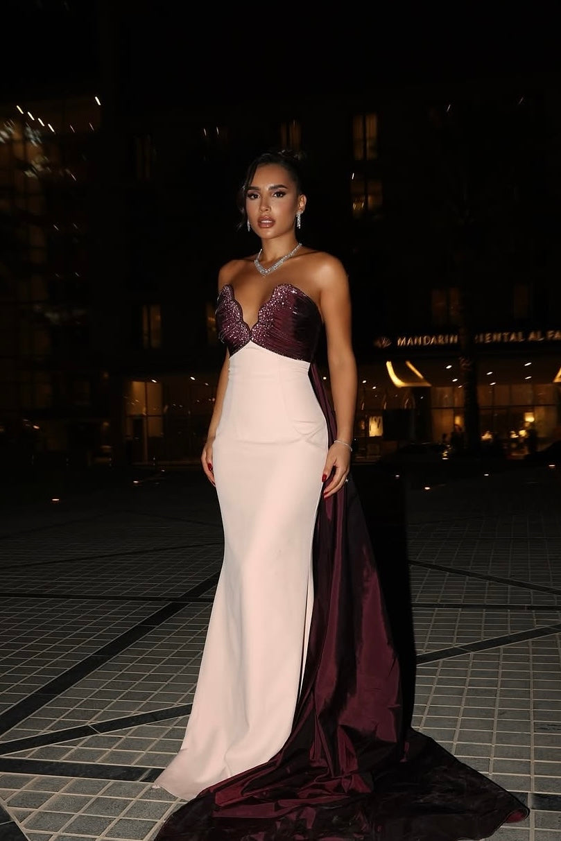 This floor-length gown is built on a close, sculpted crepe silhouette that traces the body with restraint. Over the bodice, lustrous taffeta is shaped into fluid drapery forming shell-like contours. The taffeta continues seamlessly from the front toward the back, then descends to the floor as a single extended tail. Its scalloped edges follow an irregular outline, recalling the layered structure of fish scales while remaining refined and controlled.