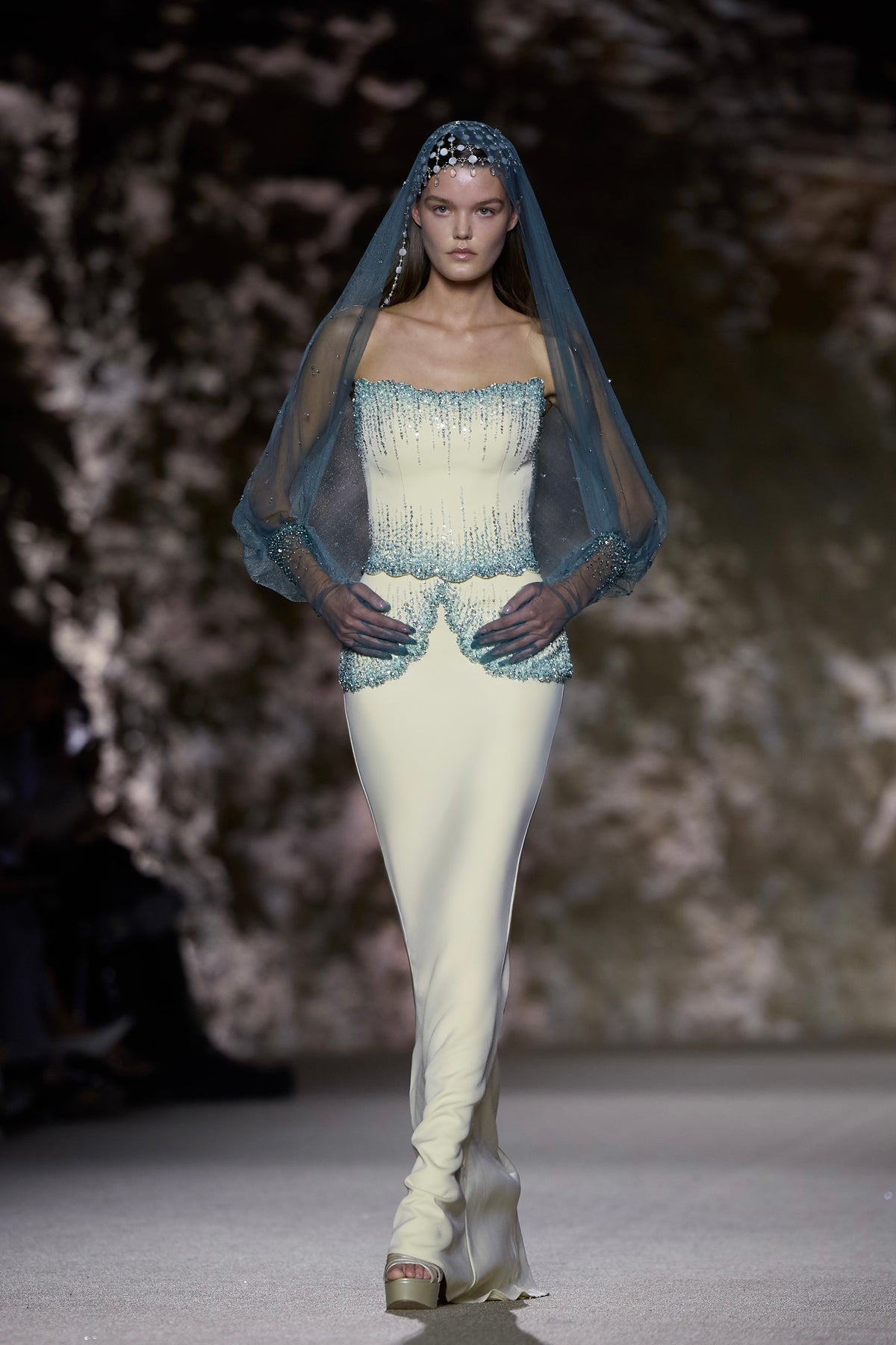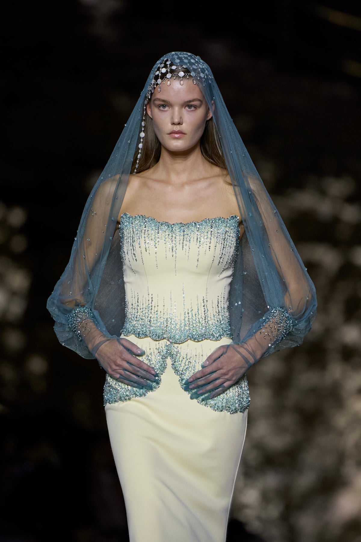 The skirt extends in mermaid cut. A sheer aqua tulle veil, executed as a separate element, drapes over the arms and head. Handcrafted by a team of five skilled couturiers over 550 hours, the ensemble reflects couture defined by precision and restraint.