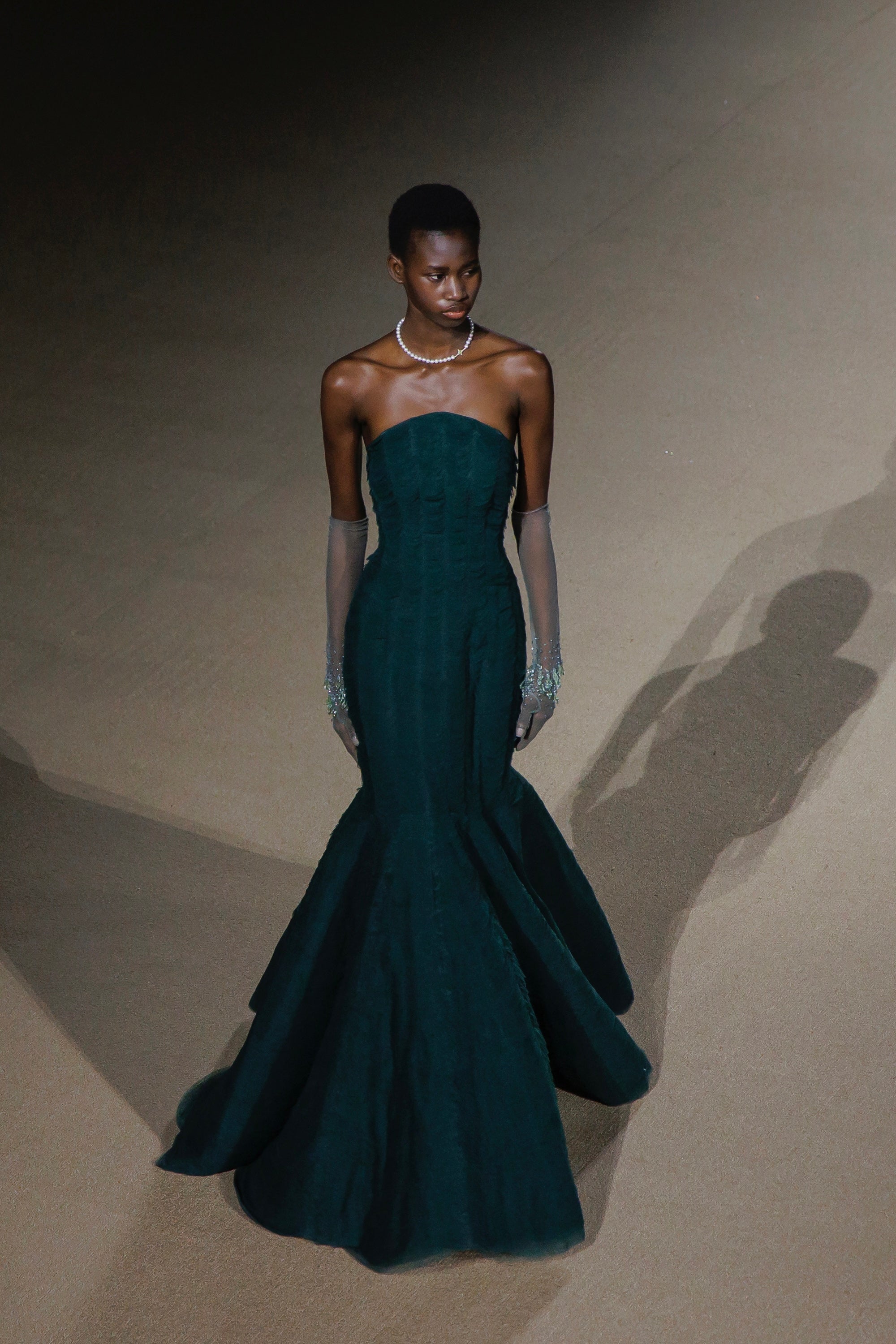 The collection traces the diver’s journey from shore to depth, and back to light. Silhouettes move with controlled fluidity: chiffons and liquid satins balanced by sculpted corsetry, nacre elements, and shell-inspired forms, where softness and strength exist in deliberate tension.