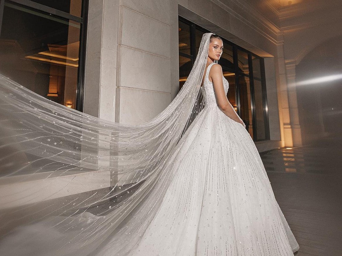 This piece was manual sewing over 63 days by 30 sewing and embroidery specialists, using ostrich feathers, crystals, stones, and several types of beads and silver and transparent sequins.