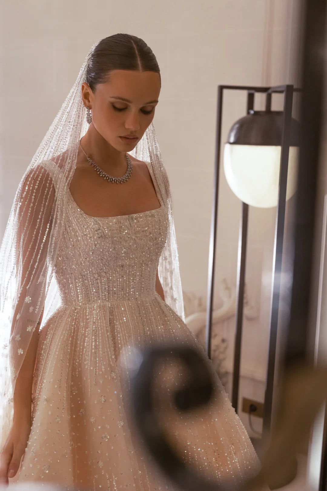 This ensemble wears A LOT of white. The layered ruffles are ample and floaty. The dress is fitted around the waist, giving an exquisite and flattering shape. The aesthetic of the gown celebrates the label's inherent feminine perspective. A nod to those who offer expression through intricate designs and patterns. The square neckline is distinguished with detailed silver sequins and Czech stone detailing, while the shimmer adds an exquisite element to the collection.